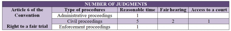 In the remaining 12 cases in which the Court found the violation of right, the applicants referred to a violation of Article 6 of the Convention providing for the right to a fair trial. These judgments can be classified into three categories based on the type of domestic procedure in which the violation occurred, and three sub-categories, evaluating the type of violation of rights within these procedures. In this regard, the violation of the right to a trial within a reasonable time, a fair hearing and access to a court within the administrative, civil and enforcement proceedings may be distinguished. Thus, in relation to Serbia, in the course of 2018, the Court rendered only one judgment on the violation of the right to a trial within a reasonable time in the administrative procedure, while for the same violation within the framework of the civil procedure the Court delivered four judgments. As regards violations of the right to a fair hearing in civil proceedings, the Court rendered two judgments, while it found that access to a court within the same type of proceedings was precluded in one case. On the other hand, the violation of Article 6 of the Convention in the enforcement proceedings before the domestic courts occurred in only one case, in which it was found that the right to a trial within a reasonable time had been violated.