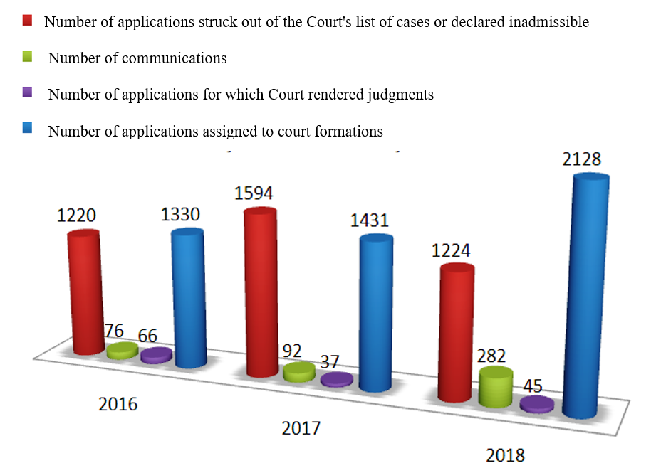 Besides the judgments, the Court may issue its acts in the form of a decision where it assesses that the application submitted is unacceptable or should be struck out of the list of cases. In 2018, the Court made decisions concerning 145 applications that were consolidated in 37 cases. A total of 7 cases failed to meet some of the admissibility criteria, while 30 were struck out of the list.