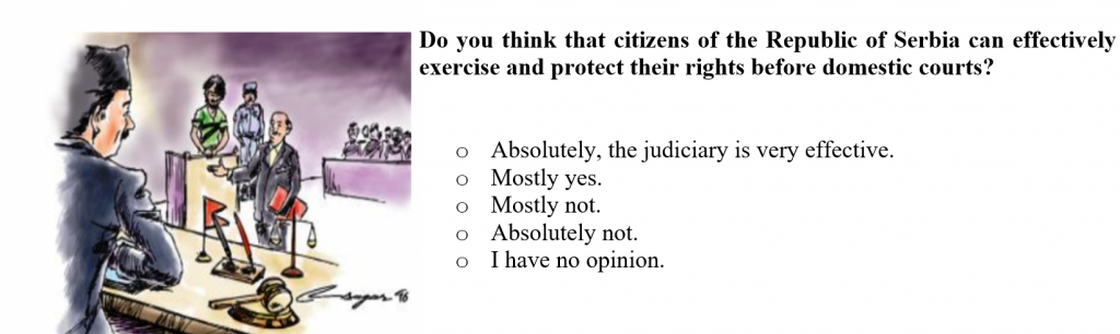 Citizens awareness of this fact was checked through a survey on our site. We asked the readers whether they would agree with a proposition that citizens of the Republic of Serbia can effectively exercise and protect their rights before domestic courts. Respondents were able to choose one of the five answers offered, which ranged from extremely positive to extremely negative attitudes. Out of the total number, 65.22% of the respondents considered that citizens generally cannot effectively protect their rights, while 21.74% considered the courts to be ineffective. On the other hand, 8.70% of the respondents considered that court protection was mostly effective, while 4.34% had no opinion on this issue. Based on these data, we conclude that the attitudes of citizens largely coincide with the jurisprudence of the European Court of Human Rights.